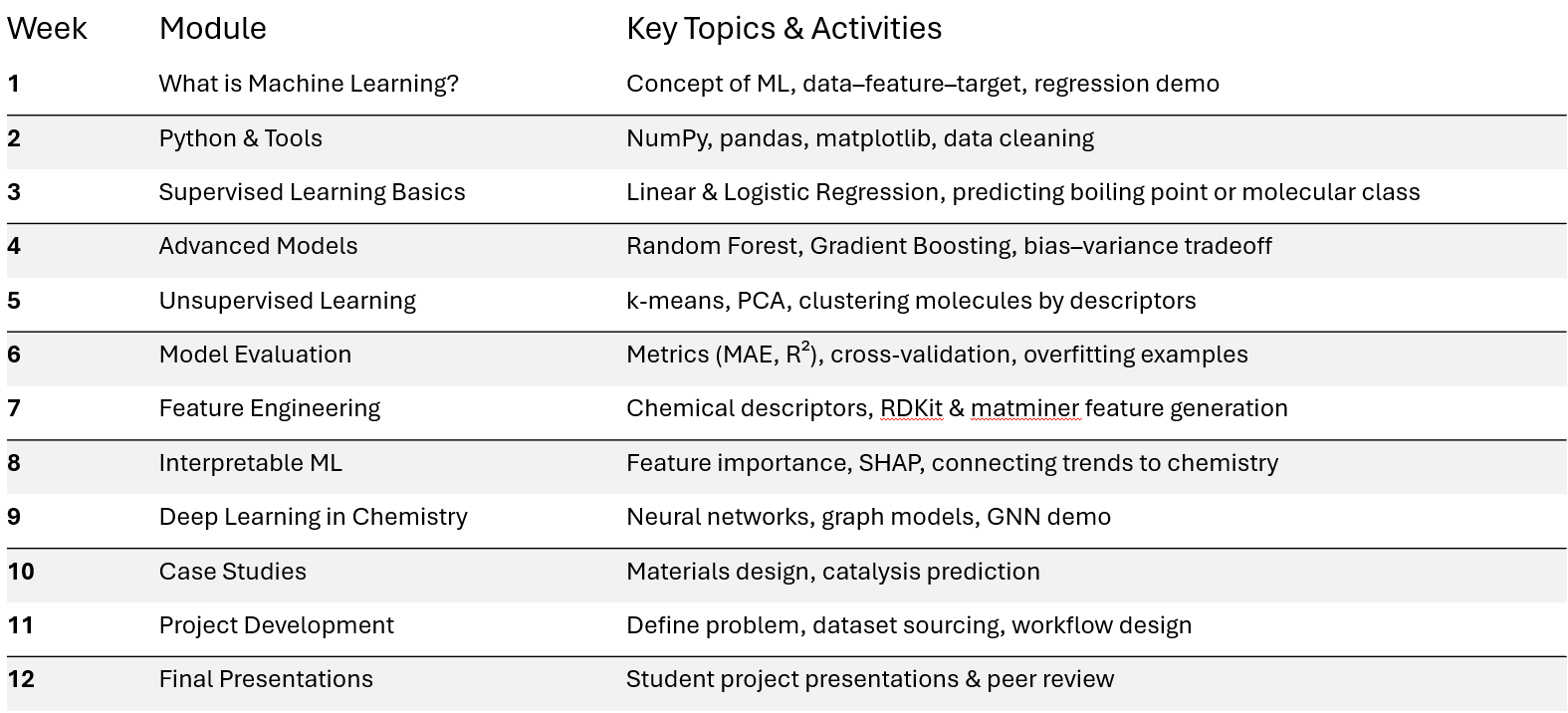 This course provides chemists with the tools to apply machine learning in chemical research. It bridges the gap between chemical intuition and computational approaches by teaching how to build, train, and interpret ML models tailored for chemistry. Students will explore case studies ranging from molecular property prediction to catalyst screening and materials design. Practical coding exercises will help participants gain hands-on skills to analyze datasets, implement models, and interpret their results.