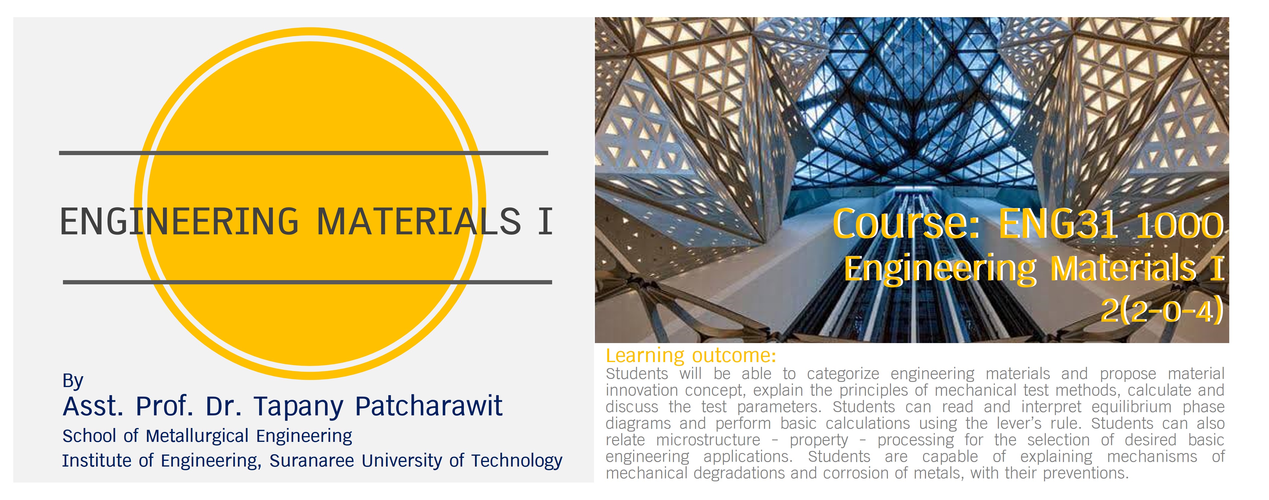 General properties of engineering materials: metals, ceramics, polymers and composite; materials innovation concept, classification of metallic materials; crystal structures of metals; macro- and micro structural examinations; mechanical properties and mechanical testing; phase equilibrium diagrams and interpretations; metal processing; heat treatment of metals; structure - property - processing - application relationships of metallic materials; mechanical degradation in services, corrosion of metals and preventions.